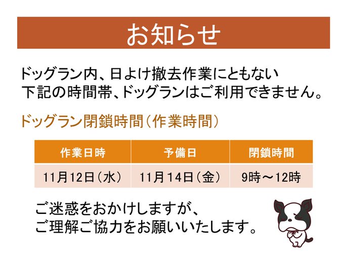 ドッグラン内、日よけ撤去作業にともない下記の日時、ドッグランはご利用できません。 ご迷惑をおかけしますが、ご理解ご協力をお願いいたします。